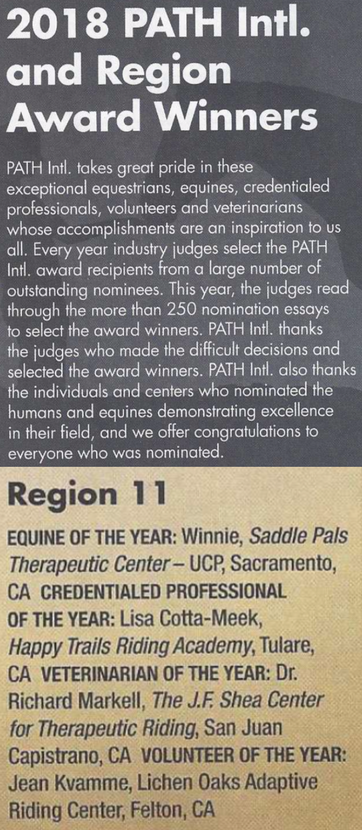 We are proud to announce LOARC’s Founder/Executive Director, Jean Kvamme, has been named PATH Region 11 Volunteer of the Year. Jean’s vision to create a place for healing and joy through equine assisted therapy has touched the lives of many in need. Her continued, tireless efforts to support and grow the center are appreciated throughout the community.